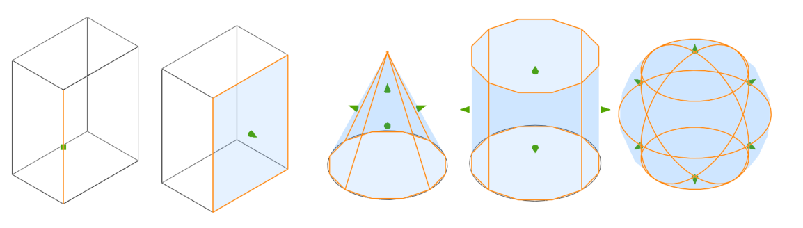 A square grip appears at the center of a selected edge, while a 3D grip appears at the center of a selected planar face. For cylindrical or spherical faces, multiple 3D grips are available, allowing for quick stretching in Model Space.