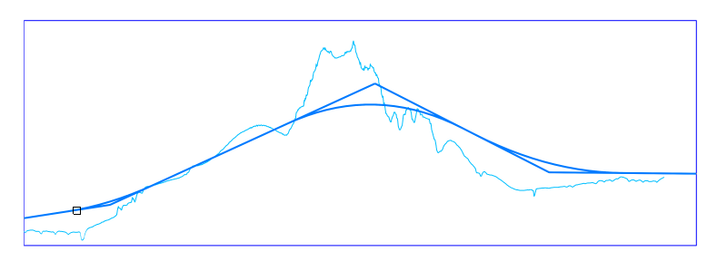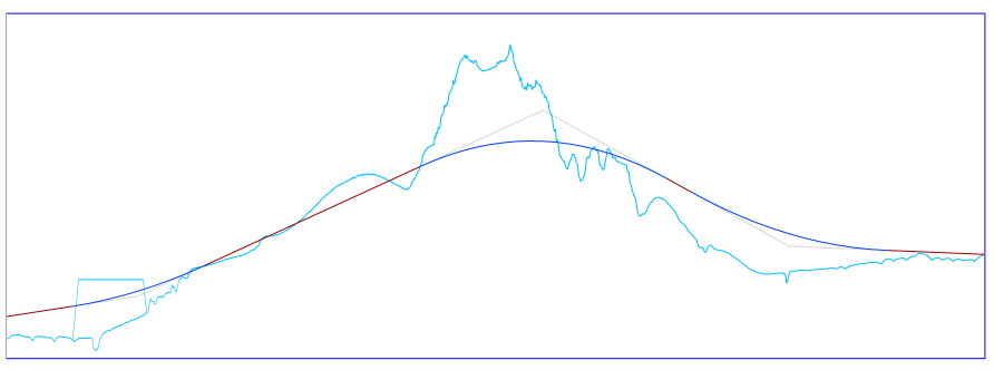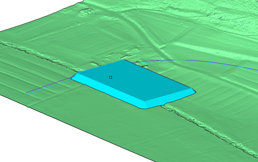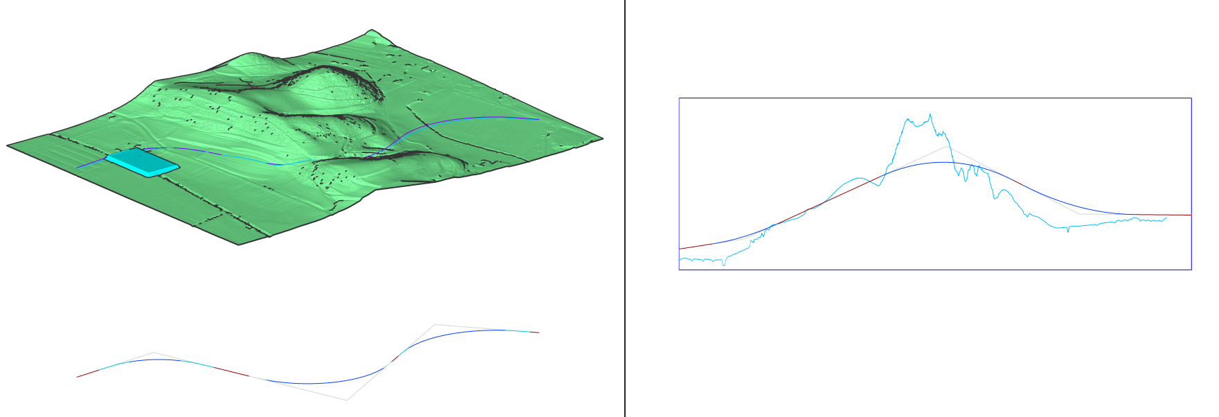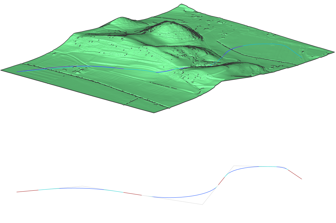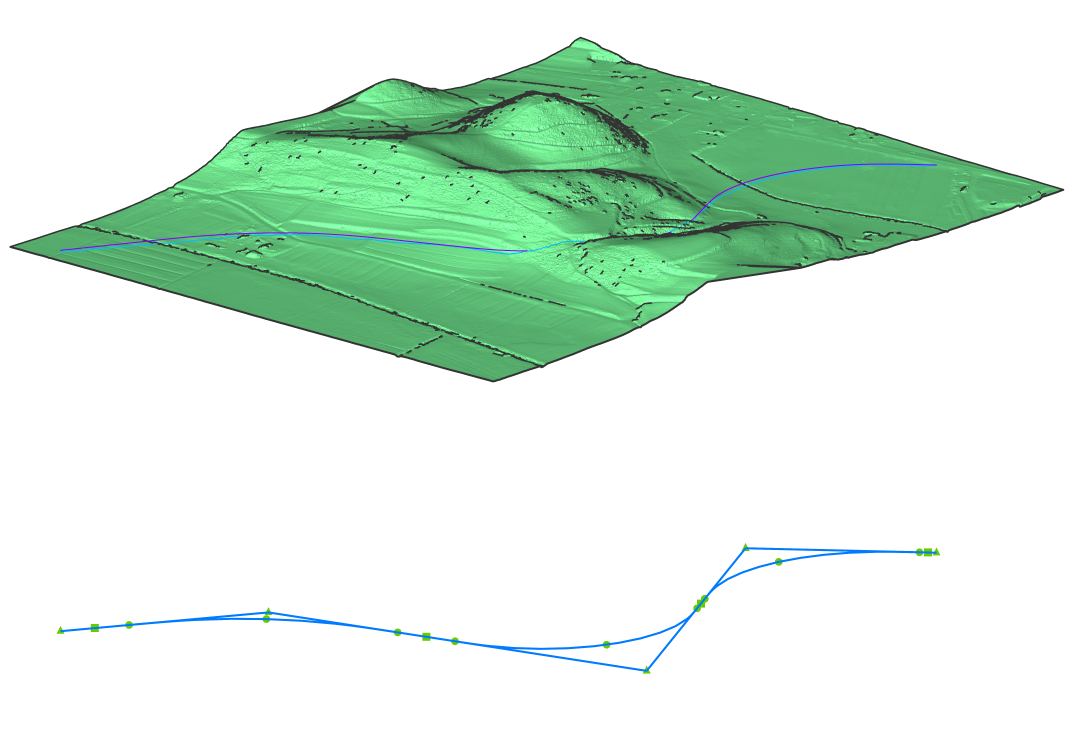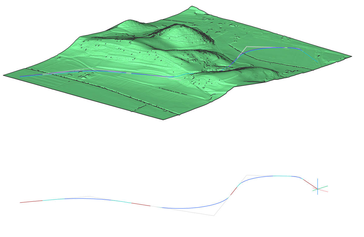 In the vertical alignment view, you can see an additional light blue line representing the grading object.