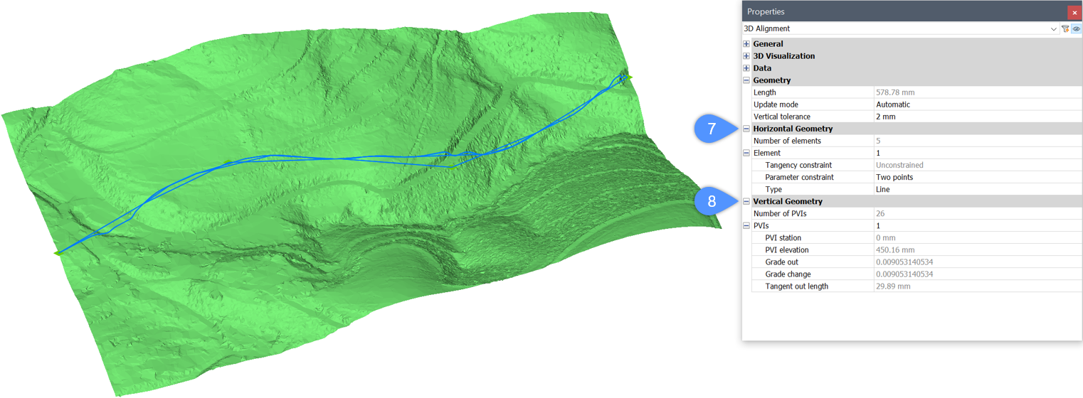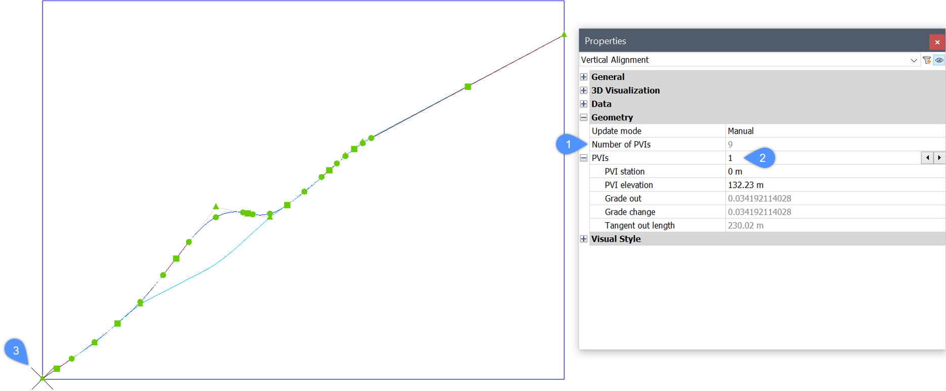 • You can switch between PVIs and edit the Alignment PVI parameters. The Vertical Alignment will be automatically updated in the drawing.