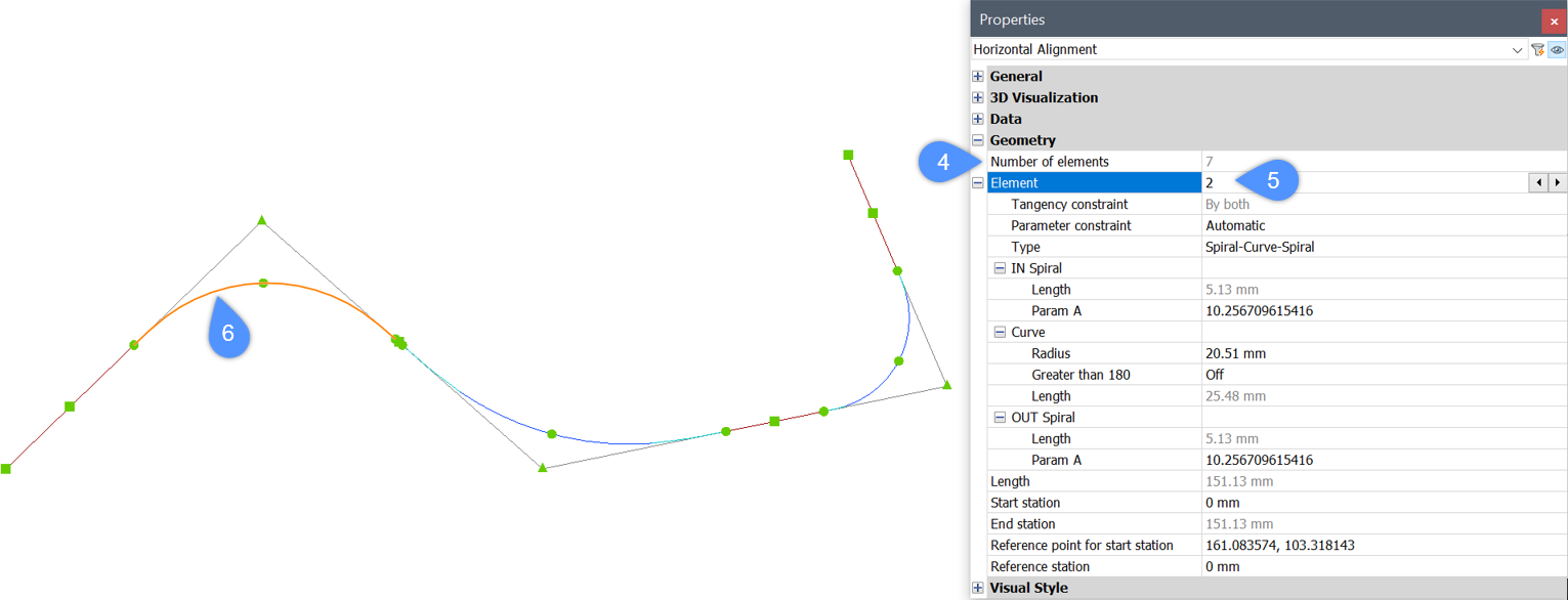 • Once click on the Element field (5), the currently selected element is highlighted in the drawing (6).