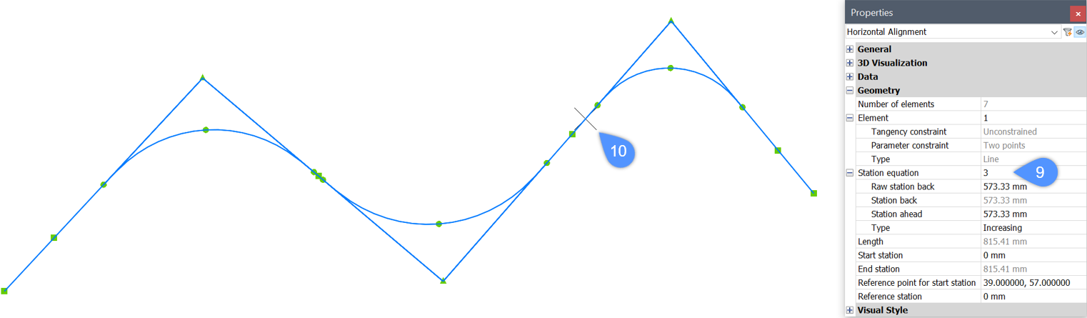 3. Once click on the Station equation field (9), the currently selected station equation is highlighted in the drawing (10).