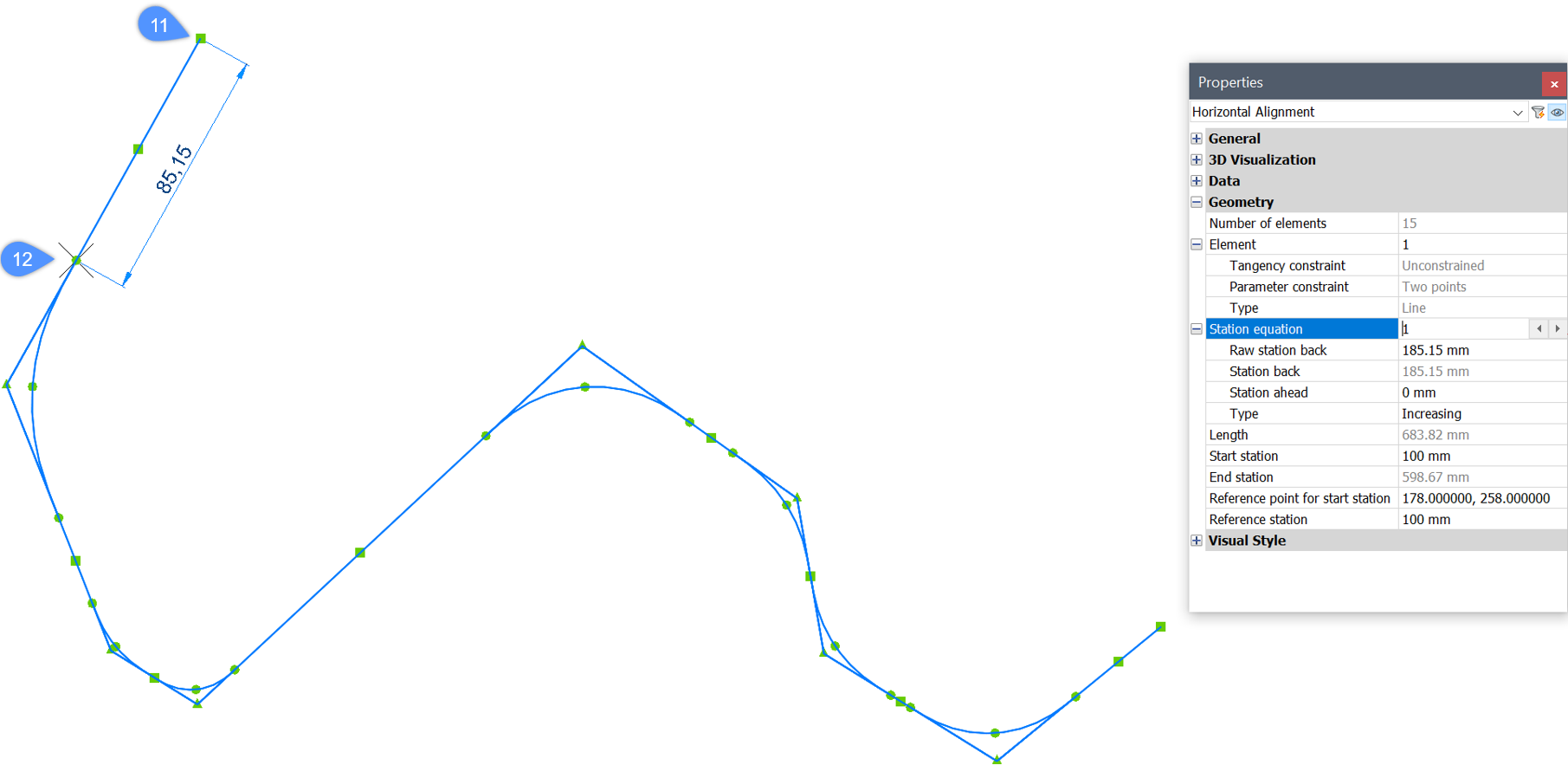 • The Raw station back value is relative to the Alignment start point (11) and the specified point for the Station Equation (12).
