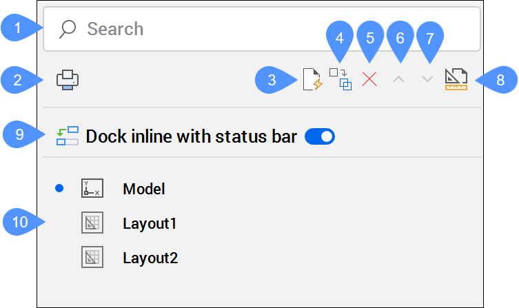 - Displays the Model and Layout tabs. Right-click a layout to open a context menu with the following options: