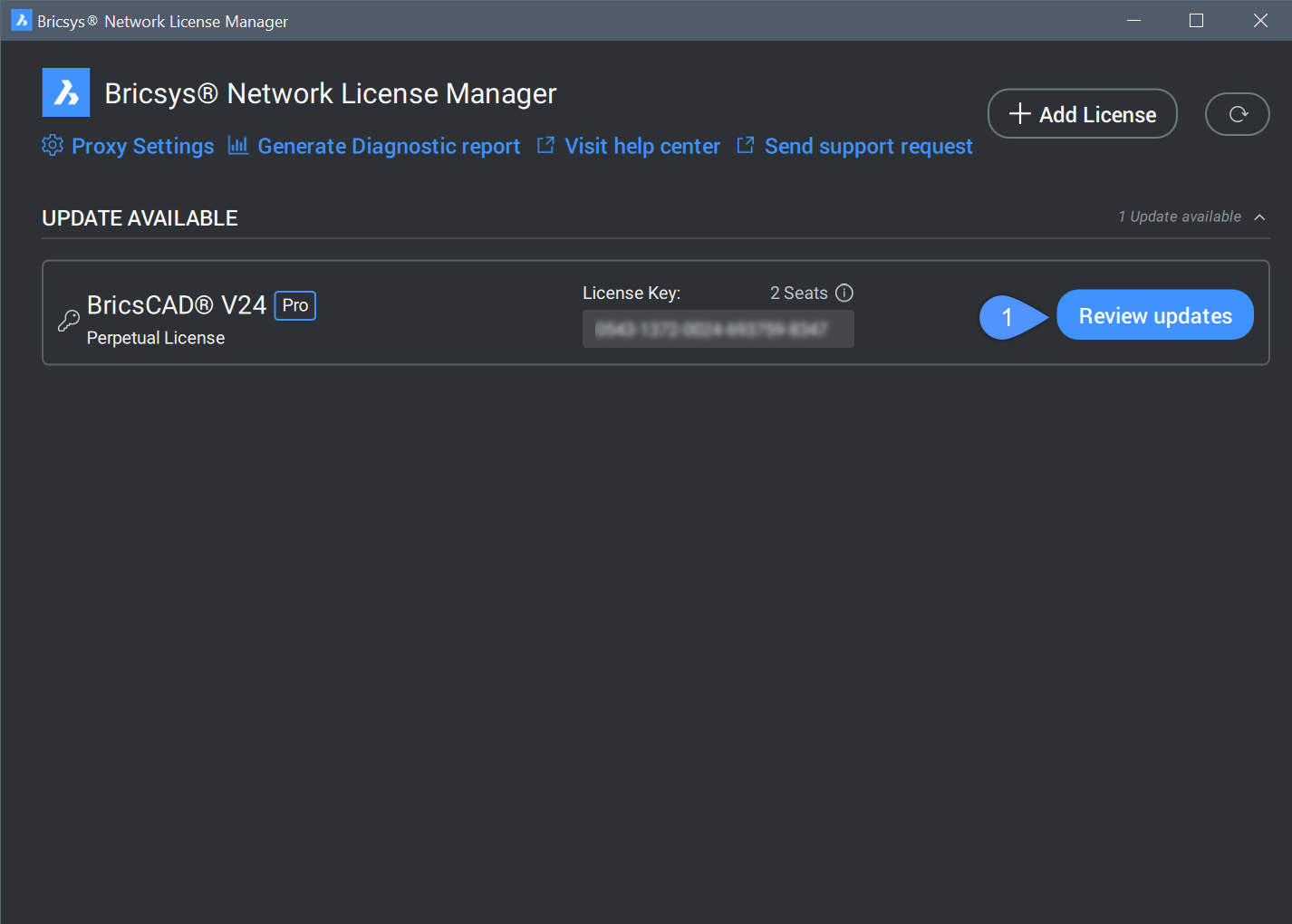 ) to have the Review updates button available.If the update of a license is not automatically detected, retrieve the license key in the My licenses section under your account. See the Where can I find my licenses? article for more information. Next, enter the key in the Bricsys Network License Manager dialog box manually using the Add a license button.