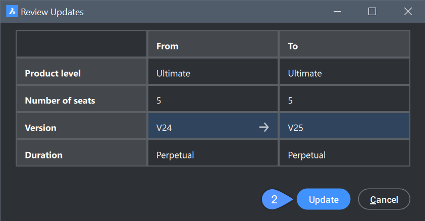 Click the Review updates button (1) to open the Review Updates dialog box to have an overview of which updates are available for that license.