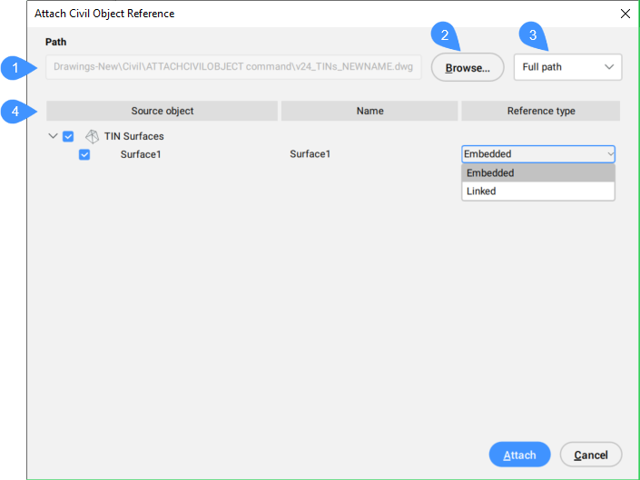 Opens the Attach Civil Object Reference dialog box to select a DWG file containing a civil object to reference it in the current drawing. After selecting the file and choosing Open, the Attach Civil Object Reference dialog box displays. The attached civil object (surface) will be visible in the Civil Explorer panel.