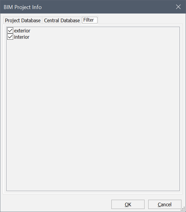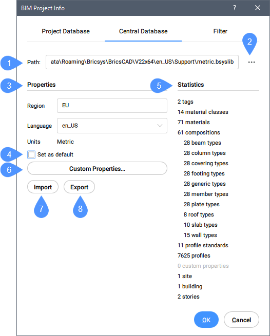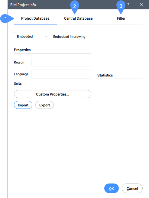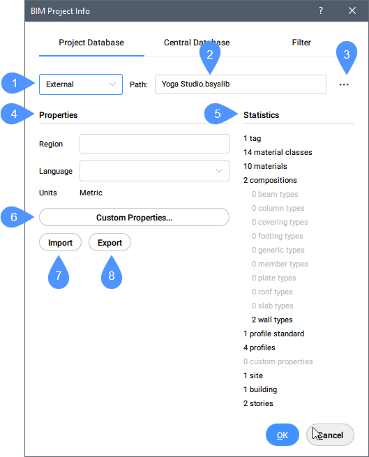 The BIM Project Info dialog box shows information about properties, materials, compositions, profiles and spatial structures of the Project and Central databases. It allows you to import or export the database and set the project database as embedded or external. When you launch the BIMPROJECTINFO command in BricsCAD®, the BIM project info displays in a dialog box that includes certain components and tabs. Project and central databases of BIM models can be changed using this dialog box.