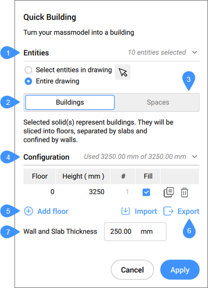 Note: The elevation input (Height) and Wall and Slab Thickness respects the insertion units of the drawing.