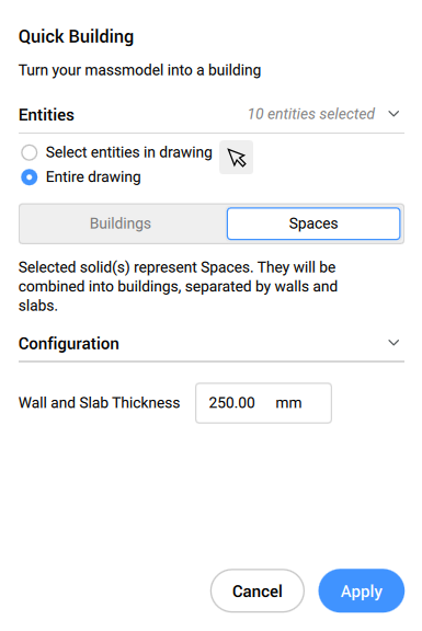 Creates a separate drawing for the generated BIM building. In this drawing, walls, slabs and roofs, as well as spatial elements such as floors and spaces will be automatically created.
