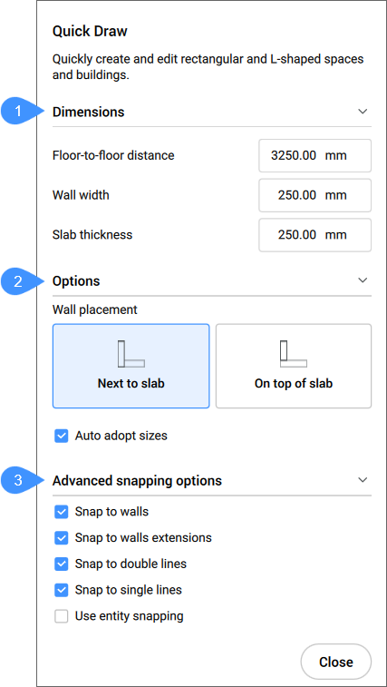 The command quickly creates and edits rectangular and L-shaped spaces and buildings. The layout of the QuickDraw cursor represents the space being created. It also indicates the alignment with existing walls and distances from existing solids.