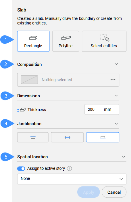 The command creates slabs based on a closed 2D curve or boundary. You can define the options through the command context panel, as well as through the Command line.