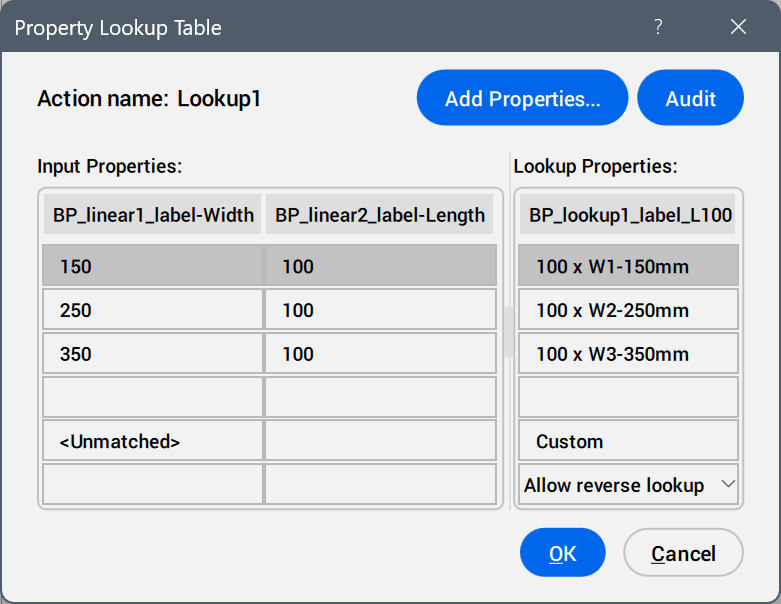 In the Block editor, double click a lookup action entity or launch the command and select a lookup action. The Property Lookup Table dialog box opens.