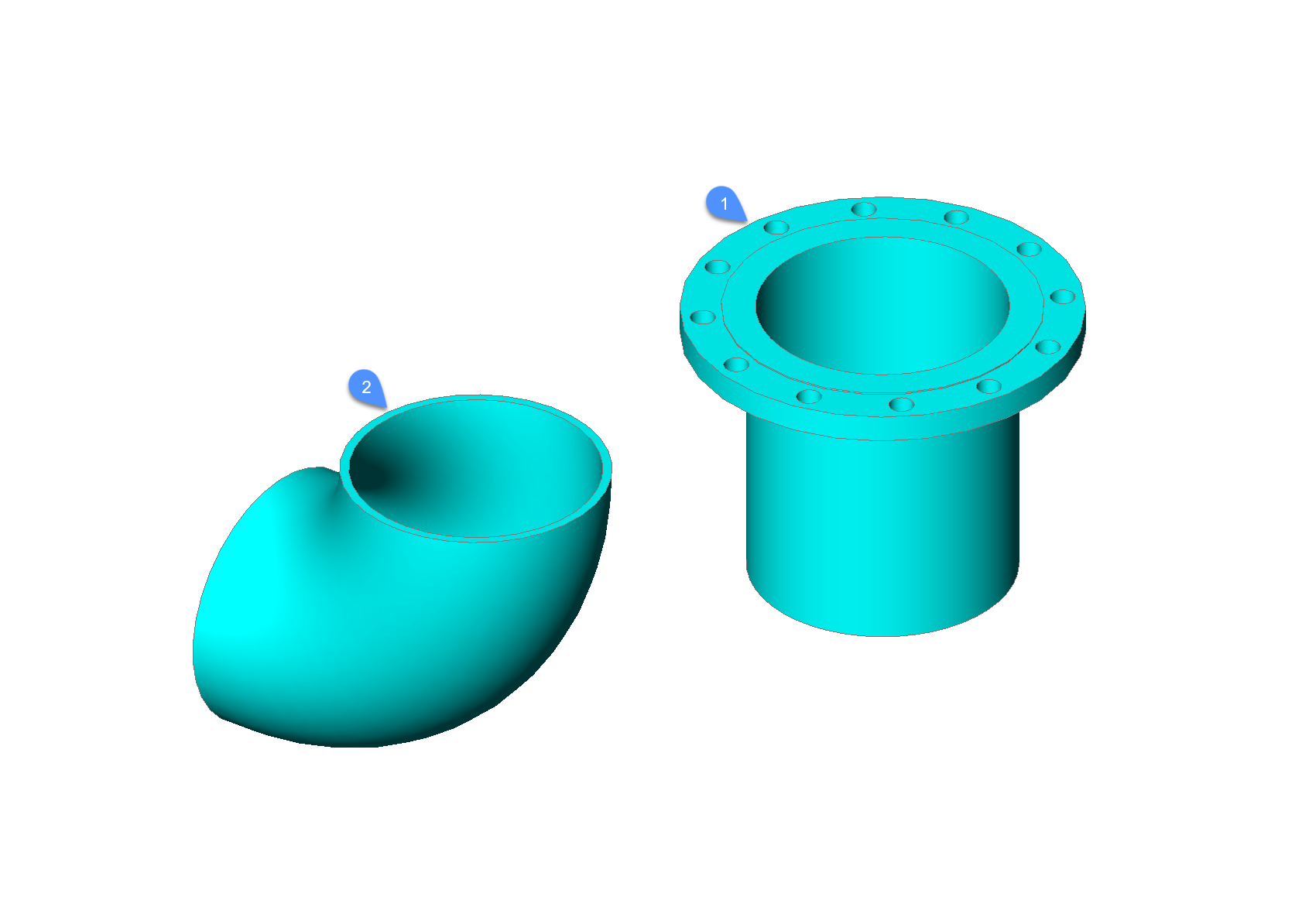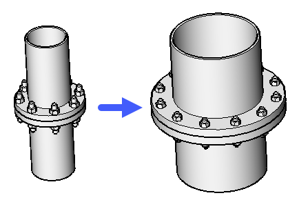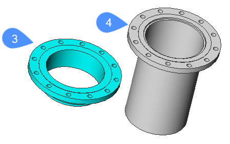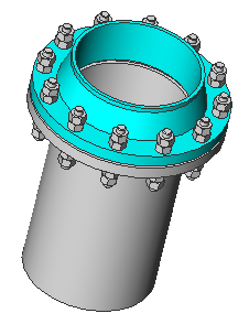 Connects two mechanical blocks by creation of 3D constraints between their connection entities. Also, under the complete flange Assembly option, a gasket and a bolting assembly are inserted, resized, and connected to a pair of flanges.