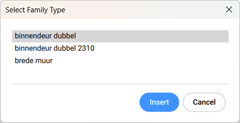 When inserting a Revit® family containing multiple types, the Select Family Type dialog box displays, which enables you to import the preferred type of the Revit® family. The RFA files attributes are also imported.