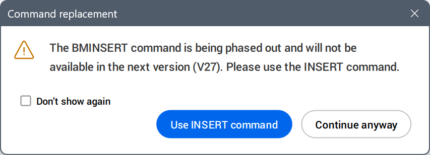 Note: The BMINSERT command is being phased out and will not be available in BricsCAD® V27. When running the command, the following dialog box appears: