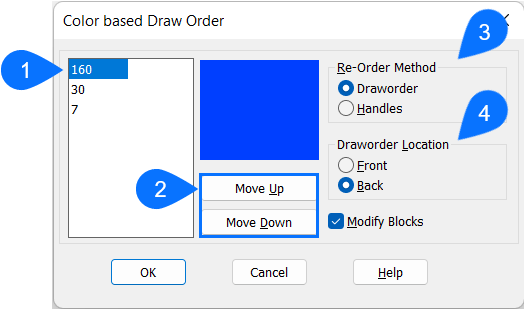 The Color based Draw Order dialog box allows you to specify the draw order of the selected entities based on their index color.