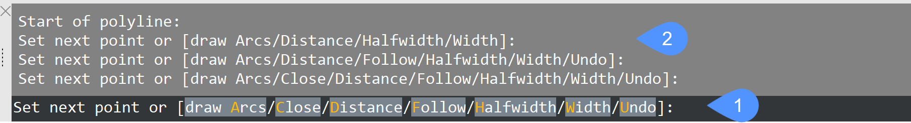 Displays the current command prompt. If no command is active, it prompts you to enter a command name. If a command is active, it displays options and prompts relevant to the current command. Prompt shortcuts are highlighted. You may enter the shortcut characters in the Command line or click on them with the left mouse button.
