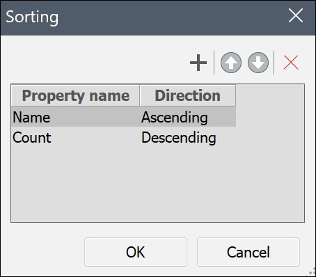 - Opens the Sorting dialog box that allows you to sort the table values. Select one or more fields and set the sorting to Ascending or Descending order.Note: The sorting respects the priority of fields, so data is first arranged by the primary field, then by secondary fields if duplicates exist. Thus, the resulting table or output file is structured and easy to read.
