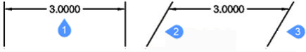 Select linear dimensions (1) and enter the obliquing angle (2). The extension lines (3) will become oblique.