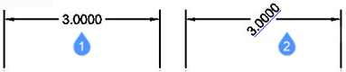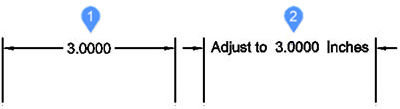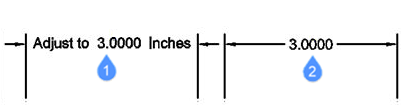 Use any selection mode to choose the dimension entities to be edited. Use the <> symbols to indicate the default text (1), so that you can insert text in front or behind the default, such as “Adjust to <> inches” (2).