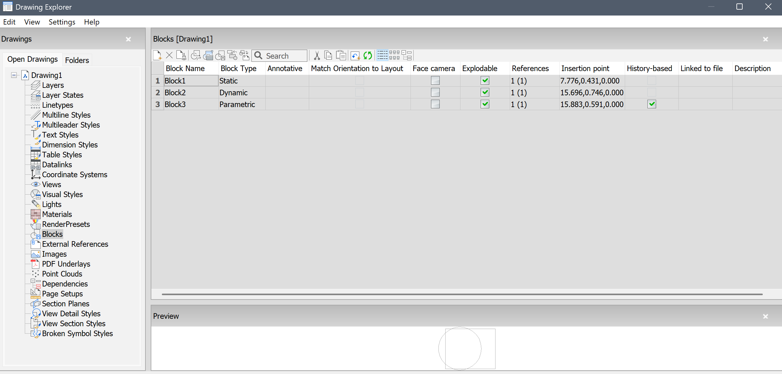 Displays the Blocks category of the Drawing Explorer dialog box: