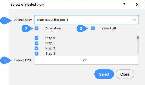 - Select all: Selects all steps of the exploded view.Note: