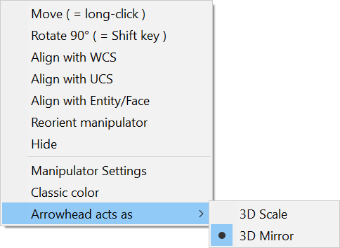 Mirrors or scales the selection. By right-clicking when hovering over the manipulator widget, a contexts menu with other options displays. Here, the function of an arrowhead can be changed between 3D mirror and 3D scale.