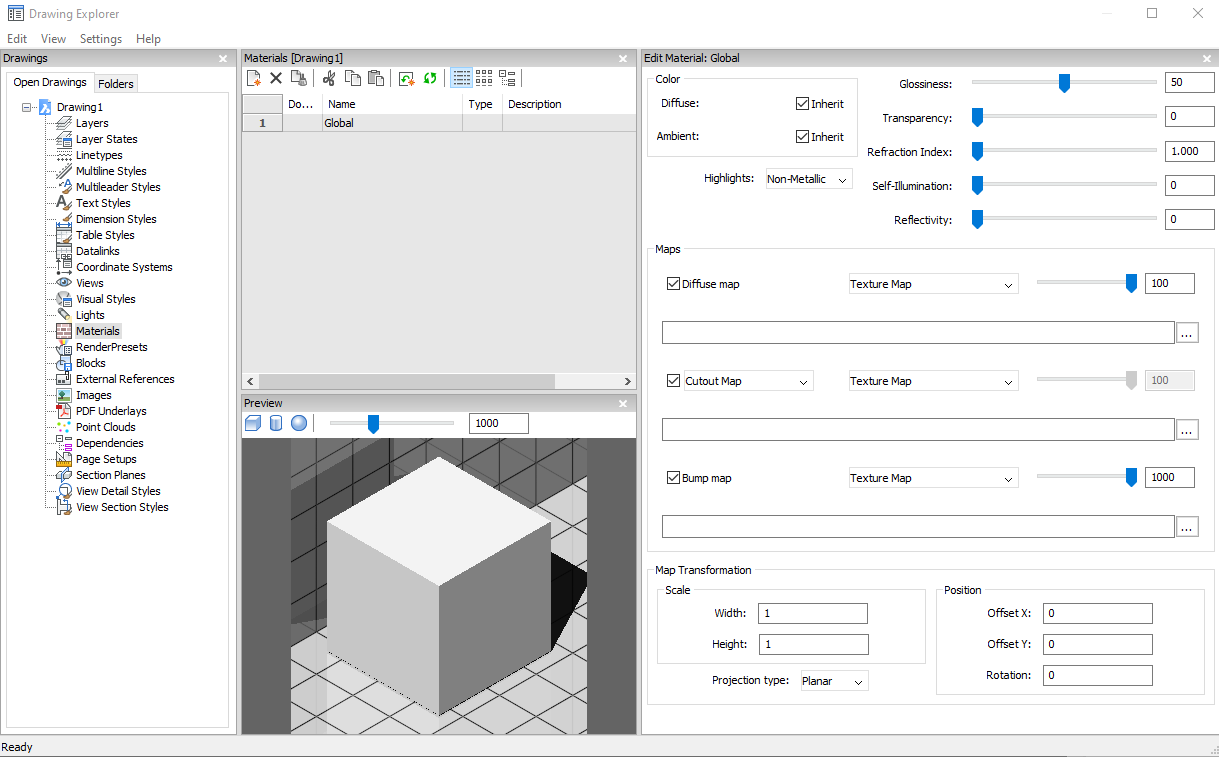 Open the Drawing Explorer dialog box with Materials category selected to view and modify materials in the current drawing.