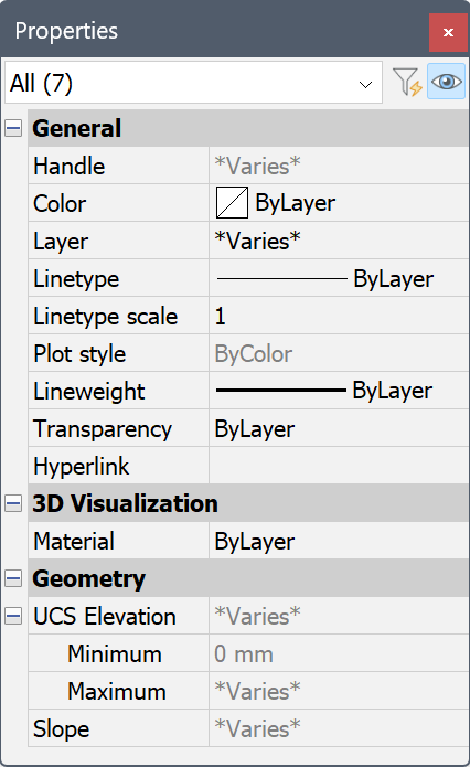 - Describes the geometric characteristics of the selected entities. These properties can vary for different types of entities.