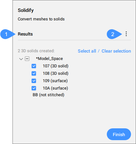- Displays the list of result types (3D solid, surface, not stitched, could not create surface).