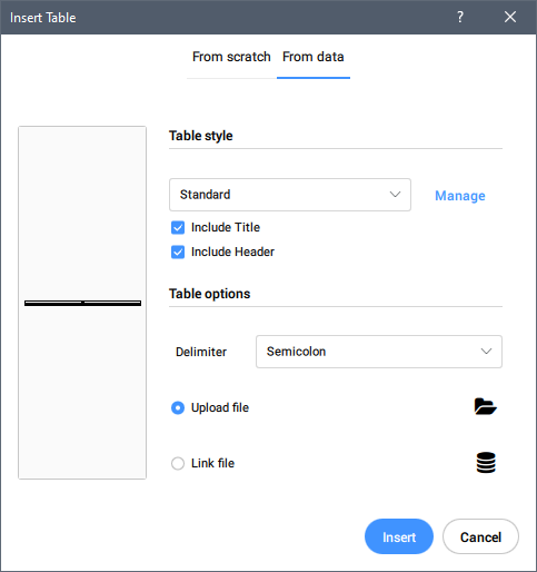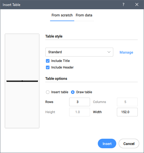 Opens the Insert Table dialog box to create a table entity in the current drawing, either from scratch or from data in an external file or a data link.