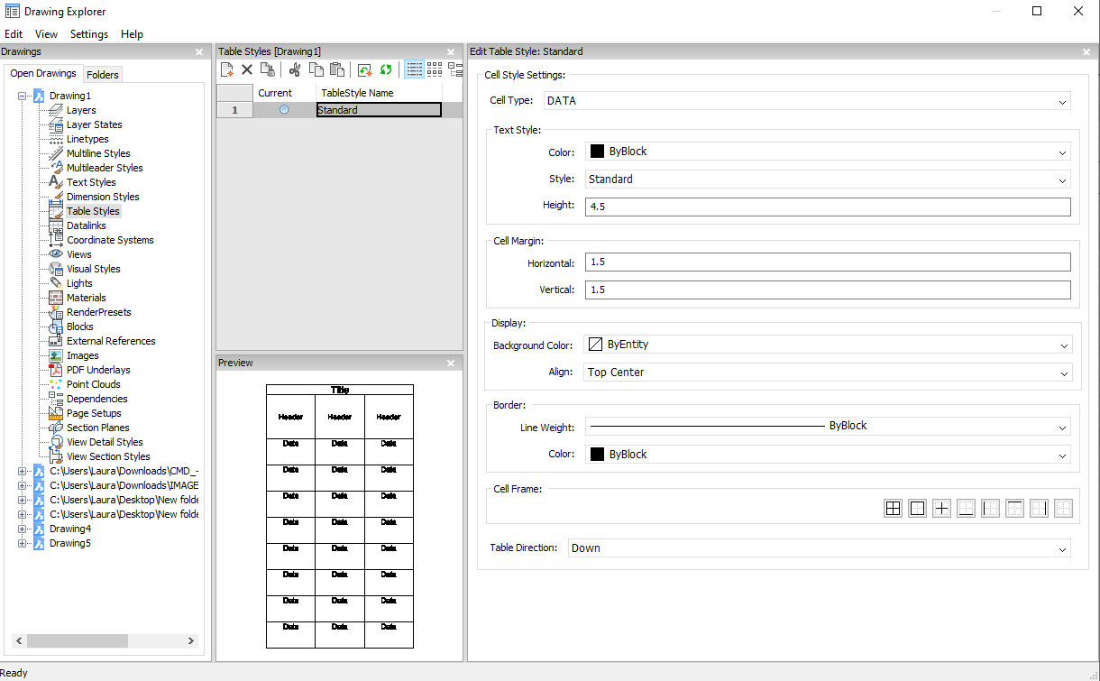 Opens the Drawing Explorer dialog box with Table Styles section selected to view and modify table styles in the current drawing.