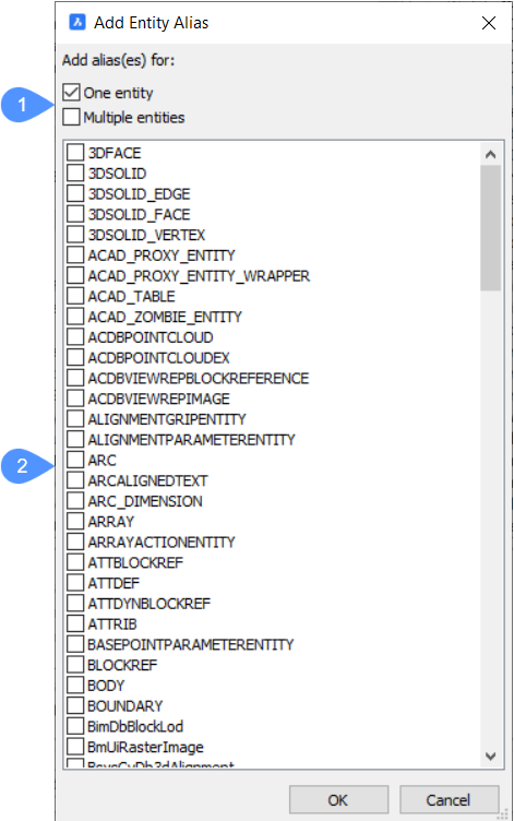 The Add Entity Alias dialog box allows you to add alias(es) for the selected entity(ies). See the Customizing the Quad article.