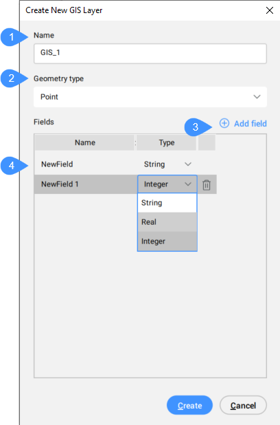 The Create New GIS Layer dialog box allows you to create a new GIS layer.