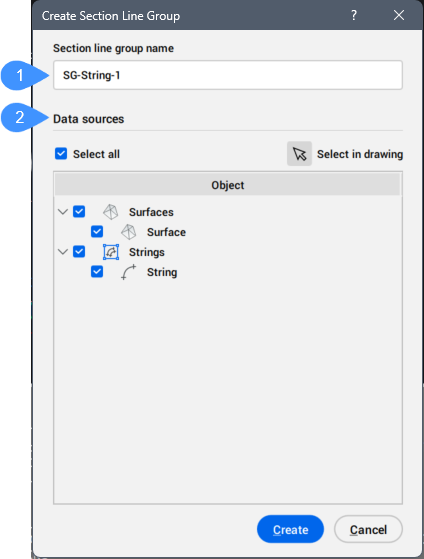 - Create Section Lines dialog box > Section line group option > right-side three dots