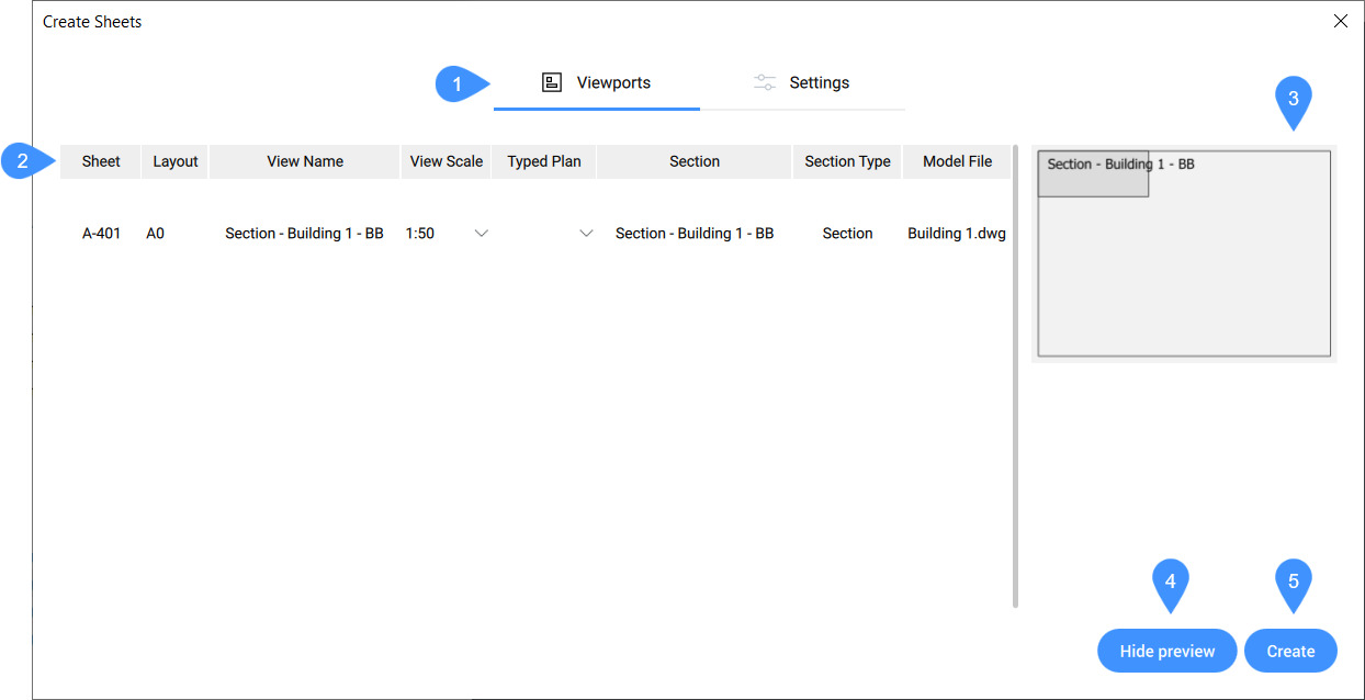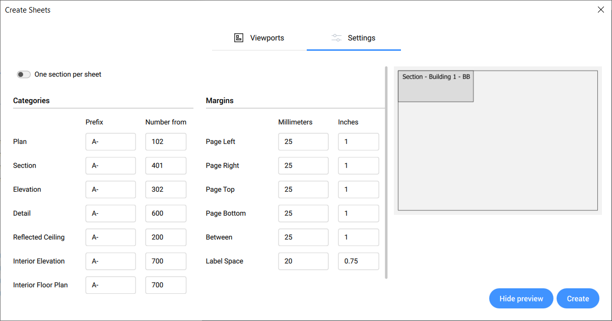 Allows you to set the layout, scale and typed plan of the viewports that will appear on the newly created sheet.