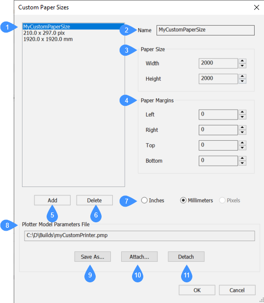 Attaches the PMP file to the plotter configuration (PC3) file. Opens Calibration data file dialog box where you have to choose a PMP file. The custom paper size will be available in the drop-down paper size list.