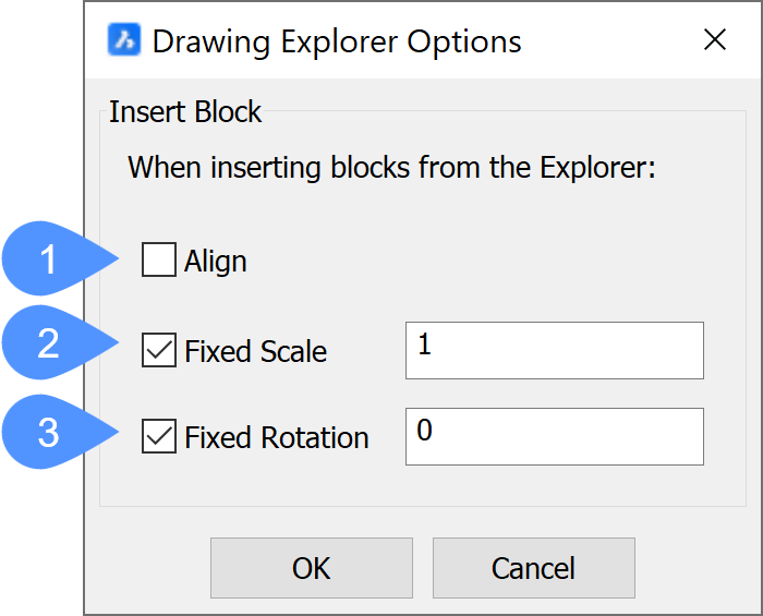 The Drawing Explorer Options dialog box allows you to align or set the scale and the rotation of the inserted blocks.