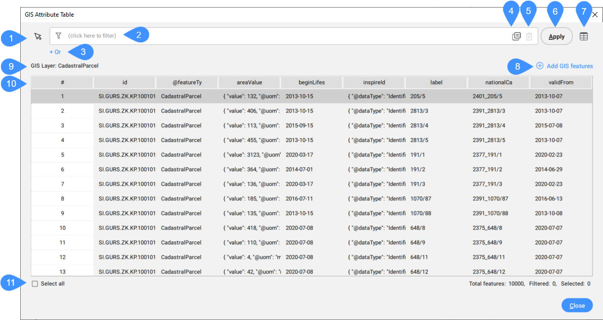 The GIS Attribute Table is a dialog box that allows interaction of a GIS attribute in the table with GIS entities (geometry) in the drawing.