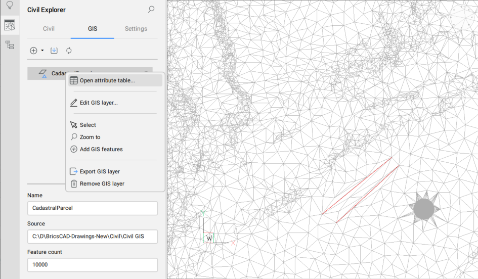 The GIS Attribute Table dialog box can be opened via the Civil Explorer panel either by double-clicking on an individual GIS layer or by right-clicking on the layer to open the context menu and select the Open attribute table option.