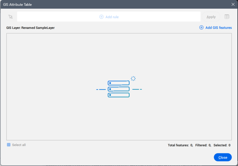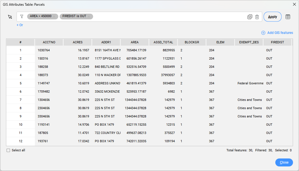 Allows you to find rows/features using an expression. All the rows that meet the specified filter rules are listed in the table.