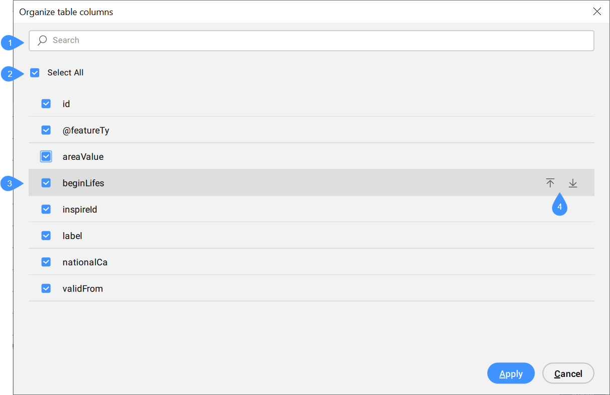 Allows you to move a field up or down in the list.