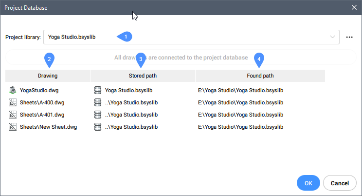 - All drawings are connected to the project database: Allows to link all drawings to the project library in one click (setting this library as their external bsyslib).Note: This button is only enabled when not all drawings are connected to the current library file.Note: A drawing that is not yet connected to the project database is marked with a yellow triangle and can be connected to the database by choosing the option from the context menu opened with right-click: