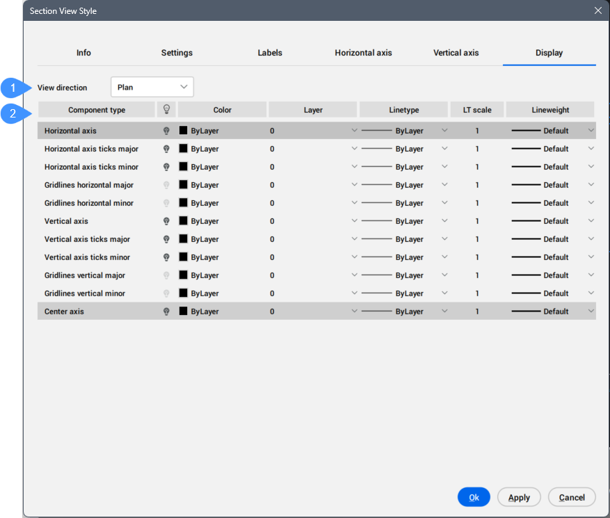 - Allows you to set how the components of section views are displayed, depending on the selected view direction.