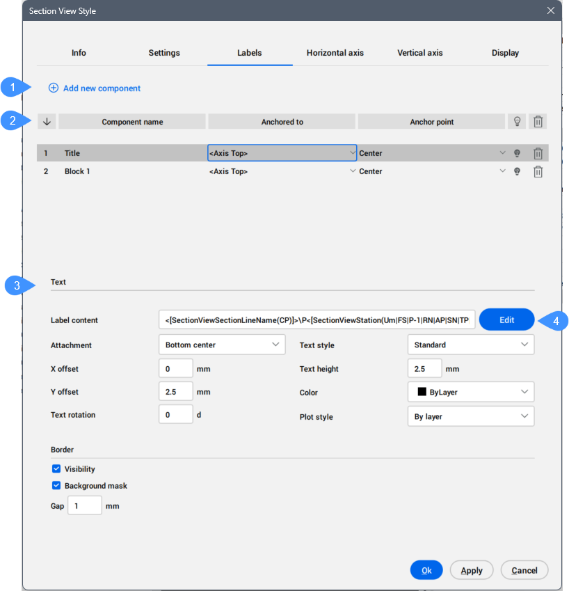 Displays text content of the section view style. To add, edit or remove attributes displayed in the label, click the Edit button to open the Text Content Editor dialog box.