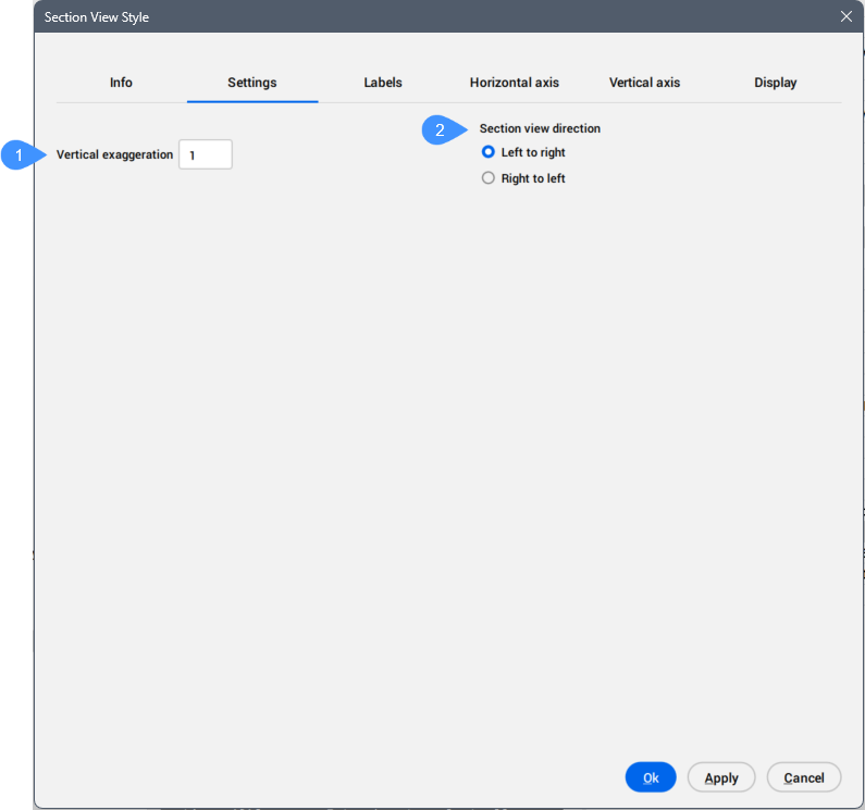 - Scales the vertical axis in section views by specifying how much elevation values are multiplied to improve the visibility of elevation changes. A value of 1 indicates no vertical exaggeration, while higher values increase the scale, making elevation differences more pronounced in the profile view.
