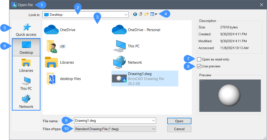 - The four standard folders in the places bar are: Desktop, Libraries, This PC, and Network.Note: The folders in the places bar of the Standard Open file dialog box are not customizable. For advanced customization options, use the Non-standard Open file dialog box (USESTANDARDOPENFILEDIALOG == 0).