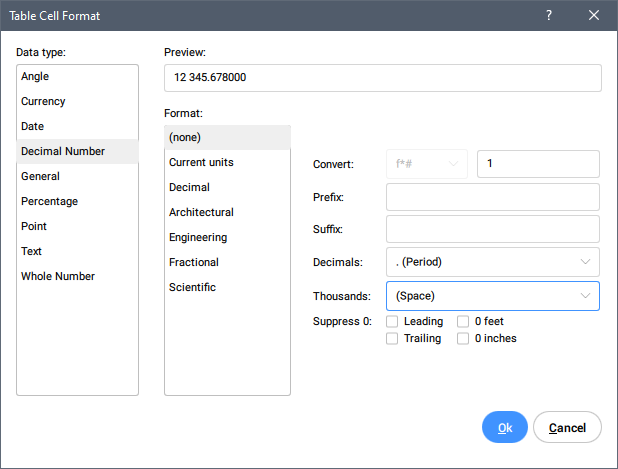 - Sets a value for conversion. The displayed value in the cell will be multiplied with this field.
