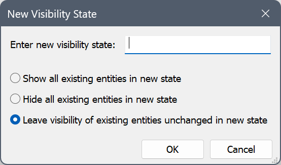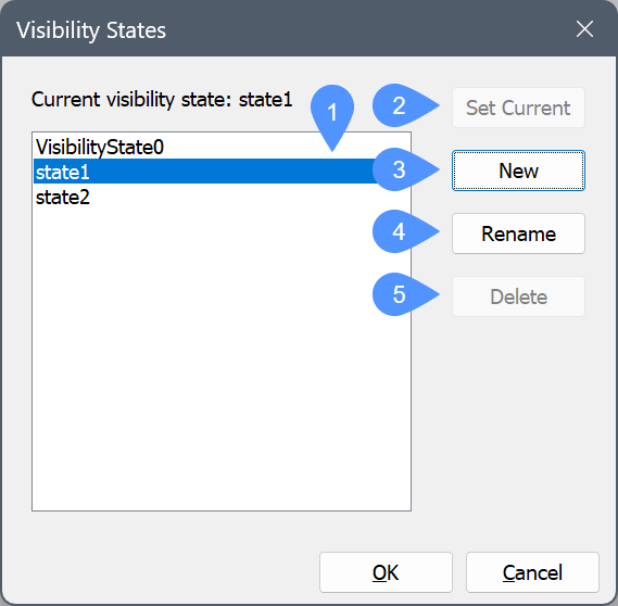 The Visibility States dialog box allows you to set the current visibility state, create new ones, and to rename or delete existing visibility states.