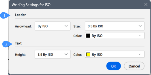 The Welding Settings dialog box allows you define the leader and text properties for weld symbol.